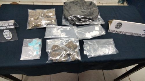 Elementos de la Policía Preventiva aseguraron a Jesús “N” de 19 años de edad, originario de Tabasco, cuando patrullaban en la colonia In House, quien al momento de su detención tenía entre sus pertenencias 16 envoltorios con posible metanfetamina, 17 con lo que parece cocaína y 8 con posible marihuana.