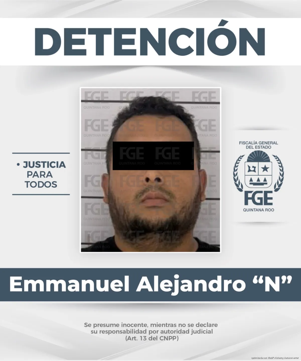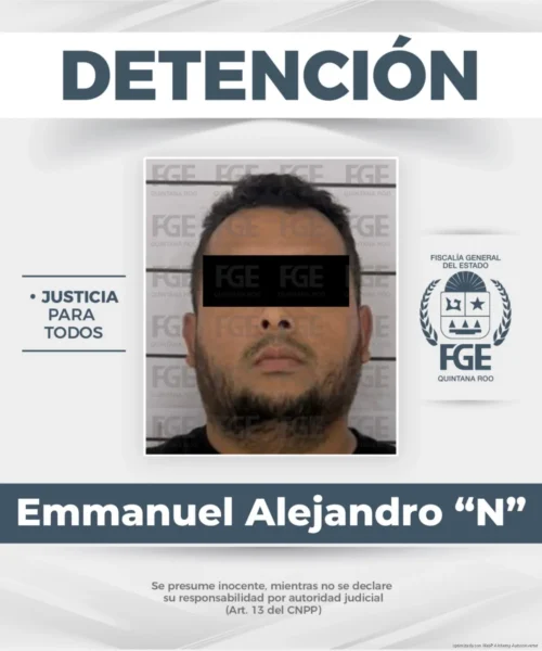 Cozumel, Quintana Roo.— Elementos de la Policía de Investigación, adscritos a la Fiscalía General del Estado (FGE) de Quintana Roo, cumplimentaron una orden de aprehensión en contra de un masculino identificado como Emmanuel Alejandro “N”, por su presunta responsabilidad en el delito de lesiones calificadas, en agravio de una mujer y dos hombres, en este municipio.