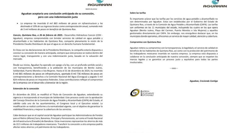 Aguakan reitera su compromiso con la transparencia, la legalidad y el servicio de calidad en beneficio de los habitantes de Quintana Roo, así como con la protección del patrimonio de los trabajadores mexicanos invertido en nuestra empresa. La empresa está dispuesta a colaborar en la conclusión anticipada de nuestra concesión, siempre que se respeten los marcos legales y se garantice un proceso justo y equitativo para todas las partes involucradas.