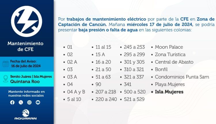 Cancún. – Se comunica a la ciudadanía del municipio de Benito Juárez e Isla Mujeres que la Comisión Federal de Electricidad (CFE), ha notificado a Aguakan que mañana miércoles 17 de julio del 2024 realizará trabajos de mantenimiento a sus redes generales de distribución, esto con el objetivo de mejorar el suministro de energía eléctrica, por lo que el servicio de agua potable se verá afectada con baja presión o falta de agua.