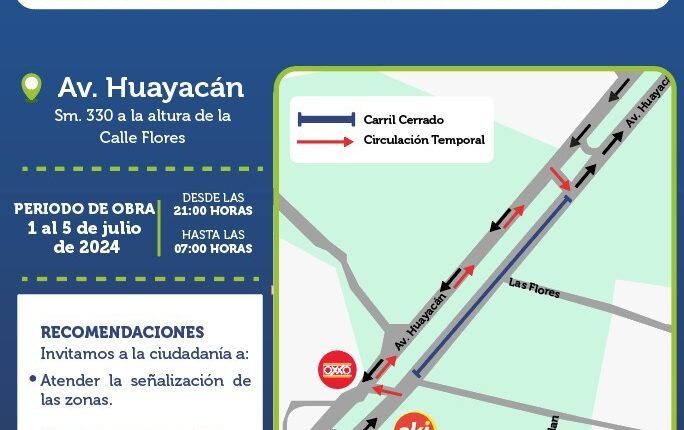 Las labores se llevarán a cabo del 1 al 5 de julio en la Smz. 330, Calle Flores de la Av. Huayacán, en un horario nocturno de 21:00 a 7:00 hrs. Es importante mencionar que se implementarán medidas para minimizar las molestias a la población, incluyendo señalizaciones precautorias y necesarias; con ajustes en la circulación vehicular, todo esto en coordinación con las autoridades correspondientes.