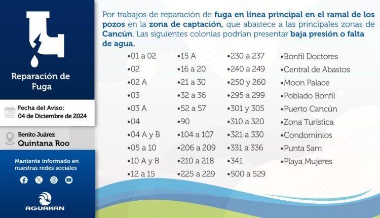 Cancún. – Durante la tarde de este miércoles 04 de diciembre, se presentó una importante fuga en línea principal de agua potable, en el ramal de pozos de la zona de captación, que abastece a las principales zonas de Cancún.