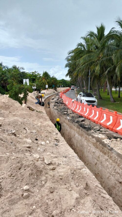 Cancún, Quintana Roo.– Aguakan avanza de manera ordenada y en coordinación con autoridades municipales y el Fideicomiso de Fomento para la Actividad Turística de Quintana Roo (Foatqroo) en la renovación y ampliación del sistema de drenaje sanitario en la tercera etapa de la Zona Hotelera de Cancún.