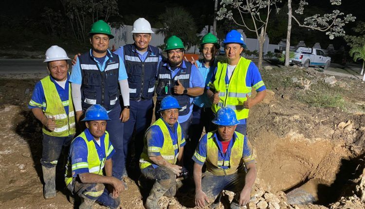 Playa del Carmen.– Tras 12 horas de trabajos continuos Aguakan concluyó la reparación de una fuga de agua potable provocada accidentalmente por la empresa constructora ICA sobre la Av. Benito Juárez y el cruce del Tren Maya quien realizaba excavaciones para la construcción del puente ferroviario.