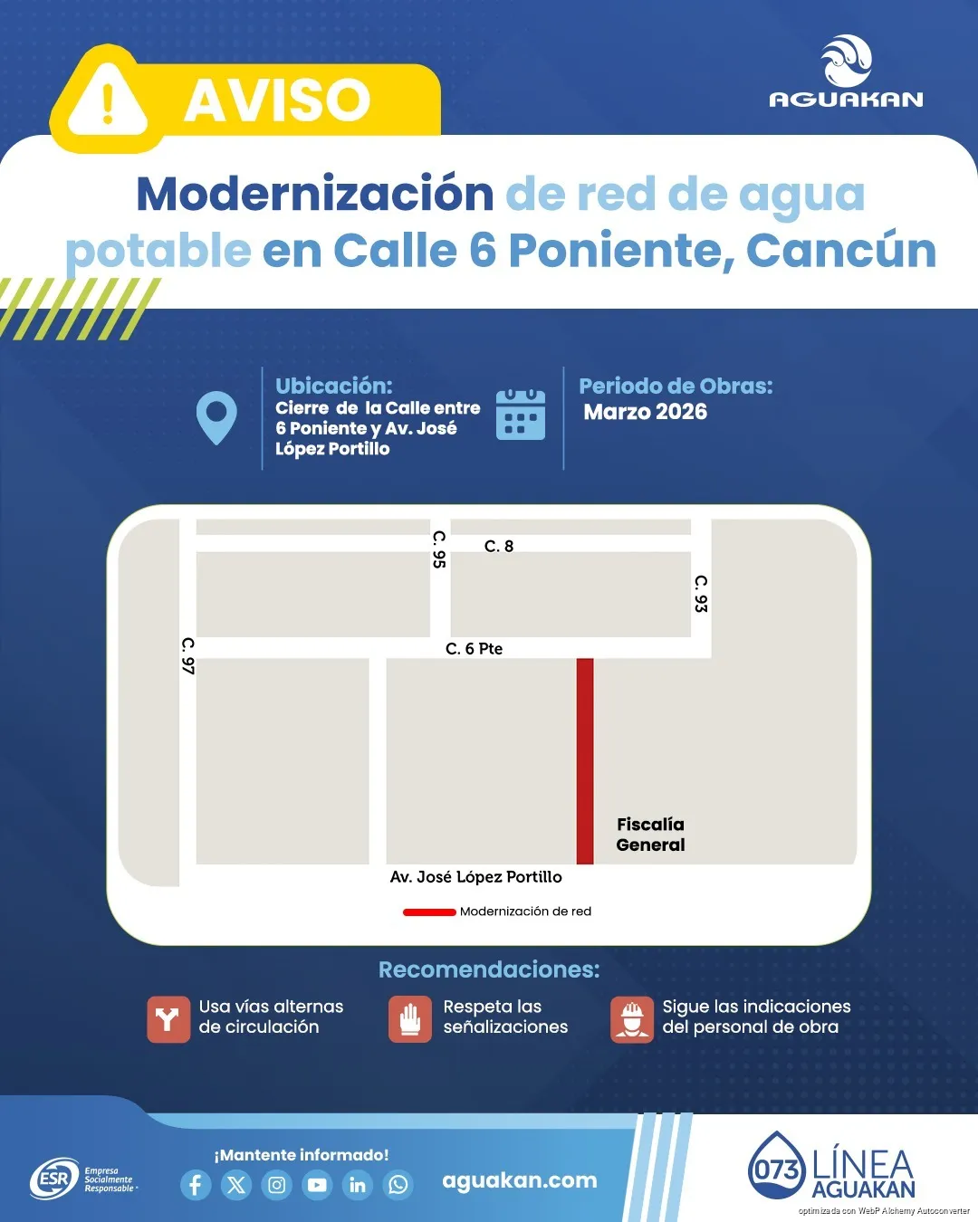 Cancún, Quintana Roo.— Con el objetivo de fortalecer la infraestructura hidráulica de la ciudad, la empresa Aguakan anunció trabajos de modernización de la red de agua potable en las Supermanzanas 91 y 92 de Cancún.