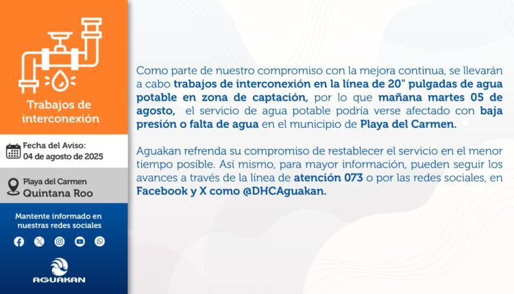 Playa del Carmen. – Aguakan informa a la comunidad que el martes 05 de agosto de 2025 se realizarán trabajos de mantenimiento programados de interconexión en la línea de agua potable de 20 pulgadas en zona de captación, por lo que se podría presentar falta de agua en el municipio de Playa del Carmen