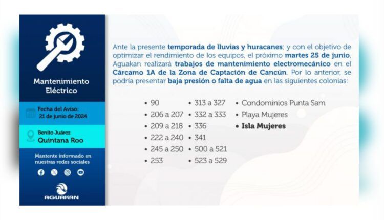 A travás de sus diversas redes sociales, Aguakan informó a toda la comunidad que apartir de mañana 25 de julio de 2024, se iniciara trabajo de mantenimiento en la Zona de Captación del municpio de Benito Juárez
