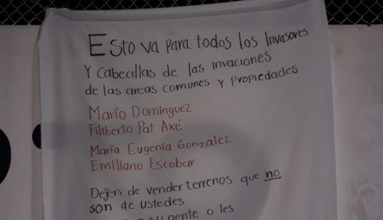 “Esto va para todos los invasores y cabecillas de las invasiones de las áreas comunes y propiedades”, señala la manta, “dejen de vender terrenos que no son de ustedes saquen a su gente o les va cargar la verga vamos a ir por sus cabezas hijos de su puta madre”.
