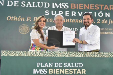 Chetumal (Macropolis QR).- El presidente Andrés Manuel López Obrador firmó como testigo de honor el documento que estipula el inicio del Plan de Salud IMSS Bienestar Quintana Roo, en compañía del director general del Instituto Mexicano del Seguro Social, Zoé Robledo Aburto y la gobernadora María Elena Lezama Espinosa.