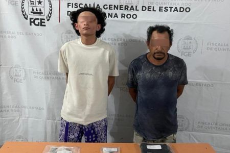 Sergio “N” y Ángel Nicolás “N” fueron detenidos en la Región 104 de la colonia Linda Vista de este municipio, cuando agentes adscritos a la Fiscalía Especializada en Combate al Delito de Narcomenudeo realizaban labores de inspección relacionadas con una carpeta de investigación.