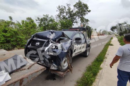 Playa del Carmen, 3 de septiembre de 2021.- Una conductora salvó milagrosamente la vida al salir por propio pie de su vehículo volcado, luego de que fuera chocada por una patrulla de Seguridad Pública Municipal sobre el camino al relleno sanitario o basurero local.