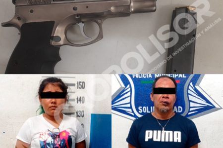 Playa del Carmen, a 4 de junio de 2021.- Como resultado de la vigilancia permanente que realizan elementos de la Secretaría de Seguridad Pública y Tránsito Municipal, este jueves aseguraron a una pareja en la colonia Luis Donaldo Colosio, luego de que los presuntos fueron reportados a la línea de emergencias 911, por lo que los efectivos arribaron al lugar para hacerles la revisión de rutina donde encontraron un arma de fuego tipo escuadra color bronce, un celular de la Marca LG de color gris y un cargador color negro con 16 cartuchos.