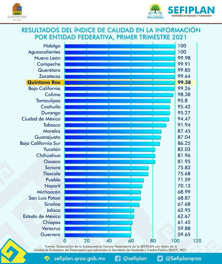 La titular de la Secretaría de Finanzas y Planeación del Estado, Yohanet Torres Muñoz indicó que “Quintana Roo se ubicó en la sexta posición a nivel nacional con un puntaje de 99.58 en el Índice de Calidad de la Información (ICI), lo cual revela la continuidad de las acciones en materia de rendición de cuentas a través del Sistema de Recursos Federales Transferidos”.