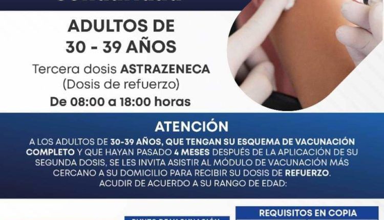 Salud municipal informó que en el caso de quienes acudan para la dosis de refuerzo deberán contar con el esquema de vacunación completo así como con cuatro meses de haberse aplicado la segunda dosis. En el caso de aplicarse la segunda dosis los adultos de 30 a 39 años deberán contar con la primera dosis de la misma marca de vacuna.