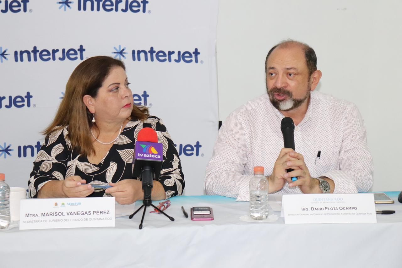 Cancún, Q. Roo., 5 de junio 2019.-Esta mañana la Secretaria de Turismo Marisol Vanegas Pérez y el director del Consejo de Promoción Turística de Quintana Roo, Darío Flota Ocampo, acudieron al lanzamiento de nuevas rutas internacionales de Interjet que conectarán Cancún con Lima, Perú y Guayaquil, Ecuador.