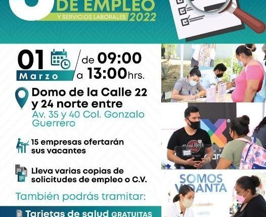 Playa del Carmen.- El día 1º. De marzo se llevará a cabo la Quinta Feria Municipal del Empleo, en el domo de la calle 22 y 24 norte entre avenida 35 y 40 colonia Gonzalo Guerrero.