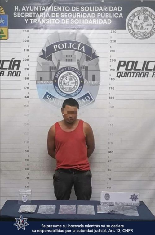 Playa del Carmen.- Como resultado del reforzamiento de vigilancia en la colonia irregular In House, la Policía Municipal de Solidaridad aseguró en dos hechos distintos, a 4 sujetos, un arma de fuego, un cargador abastecido con 3 cartuchos y más de 70 dosis de posibles drogas.