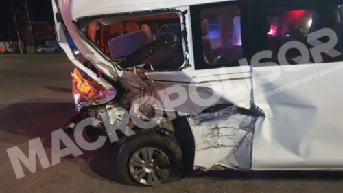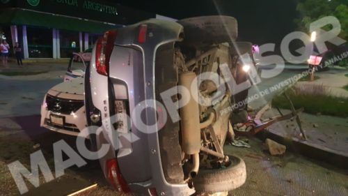 Tras el impacto contra la van de turismo, la camioneta dio un giro de 90 grados y terminó contra un taxi local que también estaba estático ante la luz roja del semáforo, terminando volcada a un costado del bulevar.