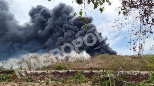 Cancún, Quintana Roo, 17 de mayo 2021.- Un incendio, que no se sabe si fue intencional o accidental, en el antiguo basurero, mantiene en jaque a bomberos que desde la noche del domingo están tratando de sofocarlo.