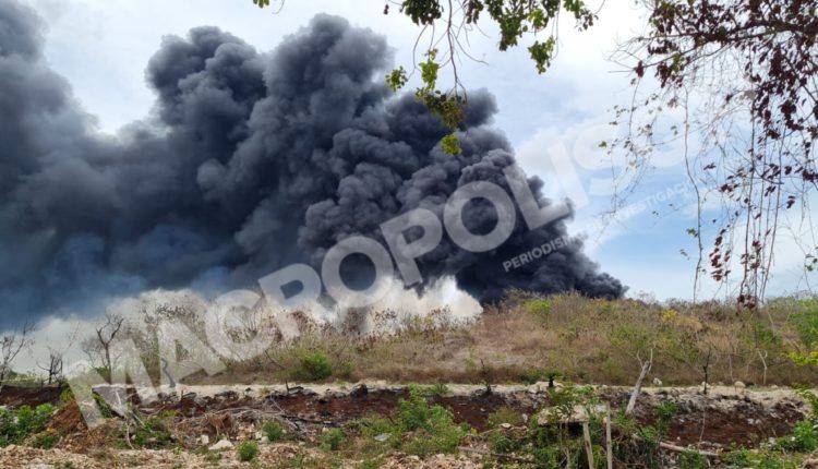Cancún, Quintana Roo, 17 de mayo 2021.- Un incendio, que no se sabe si fue intencional o accidental, en el antiguo basurero, mantiene en jaque a bomberos que desde la noche del domingo están tratando de sofocarlo.