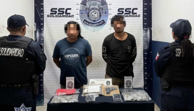 Playa del Carmen.- Policías municipales de Playa del Carmen capturaron a dos hombres por su presunta participación en delitos contra la salud y violación a la Ley Federal de Armas de Fuego y Explosivos en las inmediaciones de la colonia irregular In House.