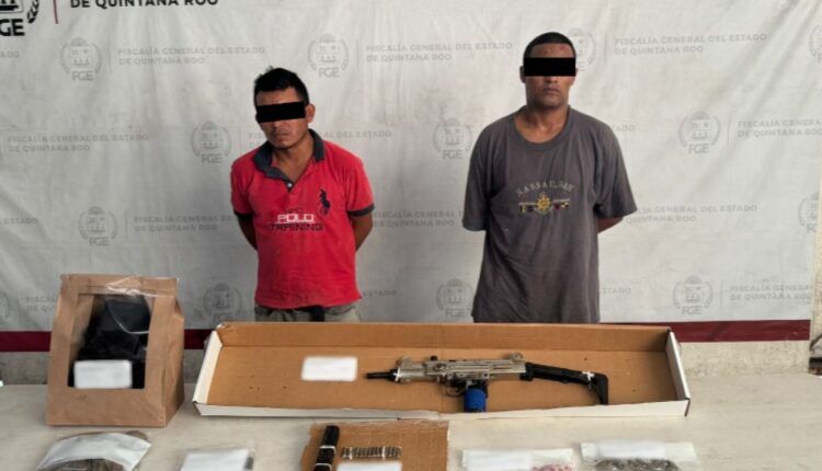 Cancún. – La Fiscalía General del Estado, a través de la Fiscalía Especializada en Combate al Delito de Narcomenudeo, logró la detención, en calles de este municipio, de Manuel Eduardo “N” y José Luis “N”, a quienes les aseguraron bolsitas con hierba verde y seca con características similares a la marihuana y un arma de fuego.