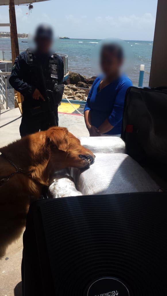Playa del Carmen, Q. Roo, 8 de Junio 2018.- Elementos de la Unidad Canina Especializada en la Detección de Narcóticos de la Policía Federal apresaron a una mujer con dos maletas de contenían en su interior varios paquetes de hierba verde, con las características propias de la marihuana, con un peso de 43 kilogramos. Así se dejan fuera del mercado ilegal unas 43 mil dosis de esta hierba.