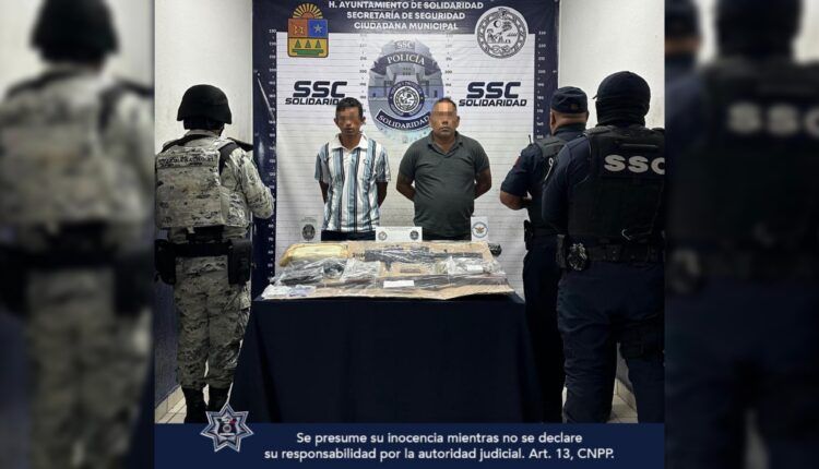 Playa del Carmen. – La Secretaría de Seguridad Ciudadana Municipal de Solidaridad detuvo a dos hombres en posesión de 63 envoltorios con presuntos narcóticos, dos armas largas y 11 cartuchos durante un operativo en el fraccionamiento Villas del Sol.