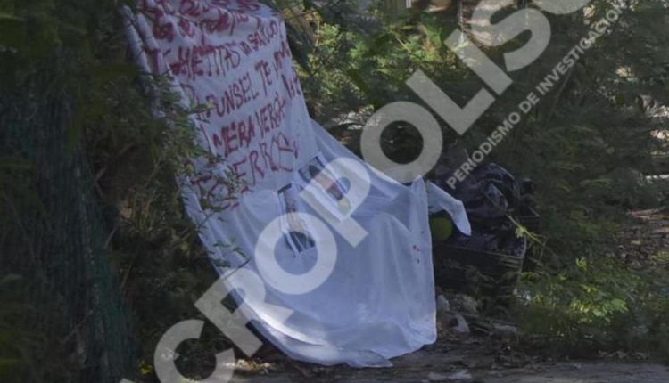 De acuerdo a la información, una persona que había salido a comprar por ese lugar se percató que en un árbol colgaba una tela con letras rojas y unas fotografías y que dentro de unas bolsas plástica parecía ser restos de un cuerpo humano por lo que informó al 911 los hechos.