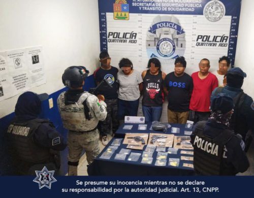 Al realizar vigilancia, la Policía Preventiva en coordinación con la Policía Estatal y la Guardia Nacional efectuaron la detención de Jesús “N” de 19 años, originario de Puebla, Carlos “N” de 34 años de Chiapas, José “N” de 45 años oriundo de Veracruz y Rosy “N” de 31 años, Francisco “N” de 29 años, Luis “N” de 25 años y Reina “N” de 49 años, originarios de Quintana Roo, tras sorprenderlos intercambiandose posibles narcóticos.