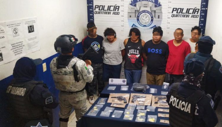 Al realizar vigilancia, la Policía Preventiva en coordinación con la Policía Estatal y la Guardia Nacional efectuaron la detención de Jesús “N” de 19 años, originario de Puebla, Carlos “N” de 34 años de Chiapas, José “N” de 45 años oriundo de Veracruz y Rosy “N” de 31 años, Francisco “N” de 29 años, Luis “N” de 25 años y Reina “N” de 49 años, originarios de Quintana Roo, tras sorprenderlos intercambiandose posibles narcóticos.