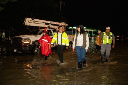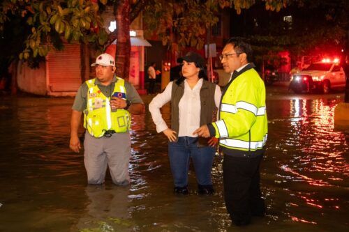 Playa del Carmen. – La presidenta municipal de Solidaridad, Estefanía Mercado, recorrió puntos críticos de la ciudad en los que se registraron encharcamientos severos a causa de la intensa lluvia que se registró la tarde noche de este jueves.