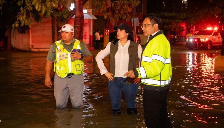 Playa del Carmen. – La presidenta municipal de Solidaridad, Estefanía Mercado, recorrió puntos críticos de la ciudad en los que se registraron encharcamientos severos a causa de la intensa lluvia que se registró la tarde noche de este jueves.