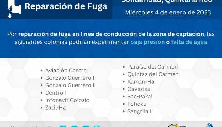 Por reparación de fuga en línea de conducción de la Zona de Captación, las siguientes colonias podrían experimentar baja presión o falta de agua. Te invitamos a tomar precauciones y a mantenerte informado del avance de los trabajos en nuestros medios oficiales.