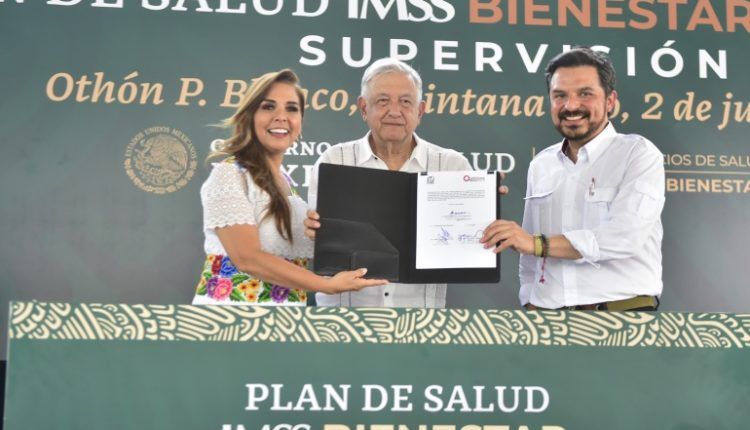 Chetumal (Macropolis QR).- El presidente Andrés Manuel López Obrador firmó como testigo de honor el documento que estipula el inicio del Plan de Salud IMSS Bienestar Quintana Roo, en compañía del director general del Instituto Mexicano del Seguro Social, Zoé Robledo Aburto y la gobernadora María Elena Lezama Espinosa.