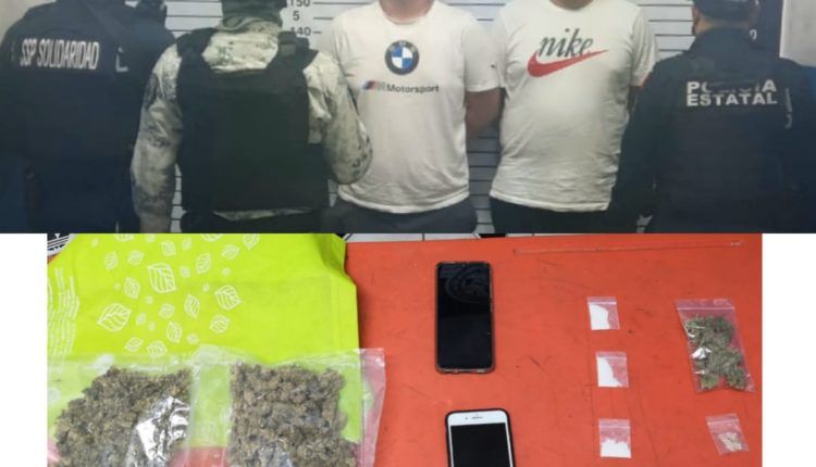 Playa del Carmen.- Dos sujetos fueron asegurados en posesión de 2 bolsas grandes con posible marihuana y 5 dosis de diversos narcóticos por policías de la Secretaría de Seguridad Pública y Tránsito Municipal de Solidaridad, de Seguridad Pública Estatal y elementos de la Guardia Nacional, en el fraccionamiento Galaxia del Carmen II.