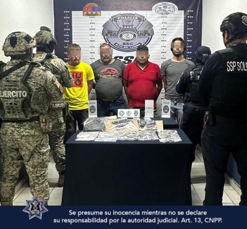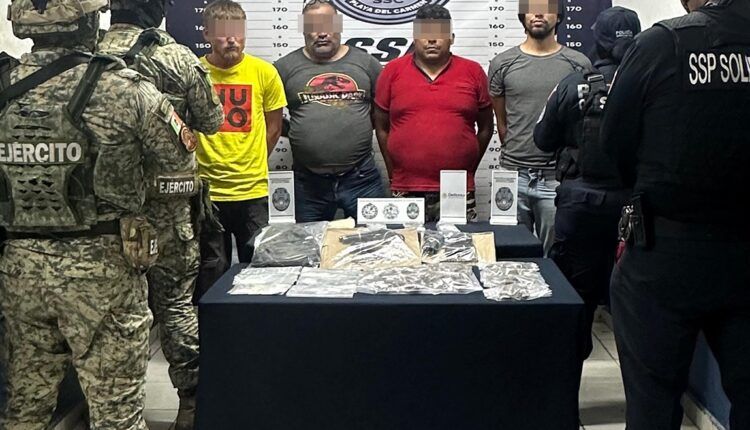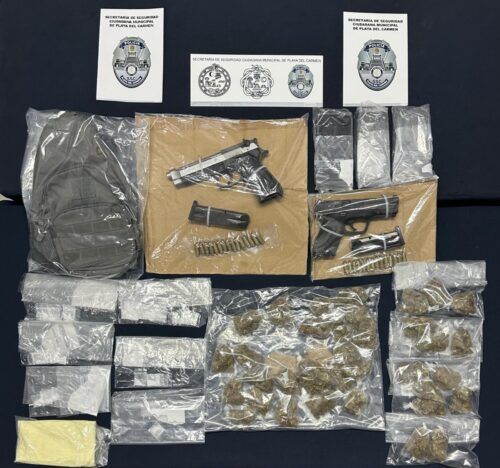 Playa del Carmen.- Polcías de Playa del Carmen detuvieron a cuatro personas por presuntos delitos contra la salud y violación a la Ley Federal de Armas de Fuego y Explosivos, con dos armas de fuego y diversos envoltorios de posibles narcóticos.