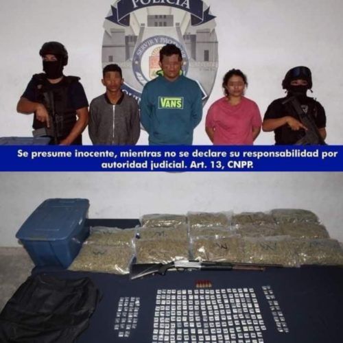 PLAYA DEL CARMEN, Quintana Roo, 15 de febrero de 2022.- Dos hombres y una mujer fueron detenidos en posesión de un arma larga en las inmediaciones de la Privada Villas del Sol Plus I de Playa del Carmen.