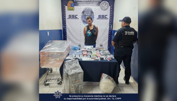 Playa del Carmen. – La Policía Municipal de Solidaridad aseguró a una persona señalada de dar un cristalazo a un vehículo y robar diversos artículos en el estacionamiento de una plaza comercial.