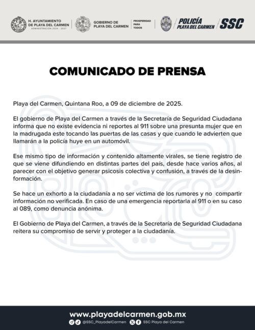 Playa del Carmen.— El Gobierno de Playa del Carmen, a través de la Secretaría de Seguridad Ciudadana, informó que no existe evidencia ni reportes al 911 relacionados con una supuesta mujer que, durante la madrugada, estaría tocando puertas de viviendas y huyendo en un automóvil cuando los habitantes amenazan con llamar a la policía.