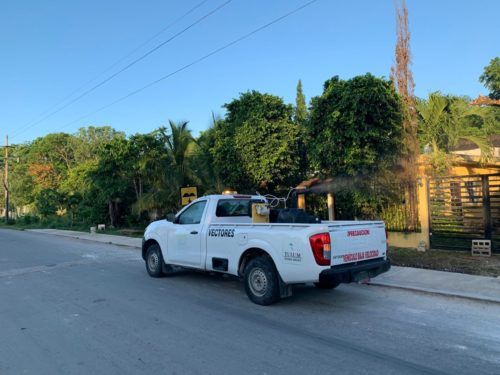 Colaboradores de la Dirección de Vectores, recorren las comunidades con apoyo de vehículos y equipos de nebulización desde el 22 de abril y continuarán hasta el 7 de julio para abarcar toda la geografía municipal, a fin de cumplir la meta de fumigar el equivalente a cinco mil 940 hectáreas.
