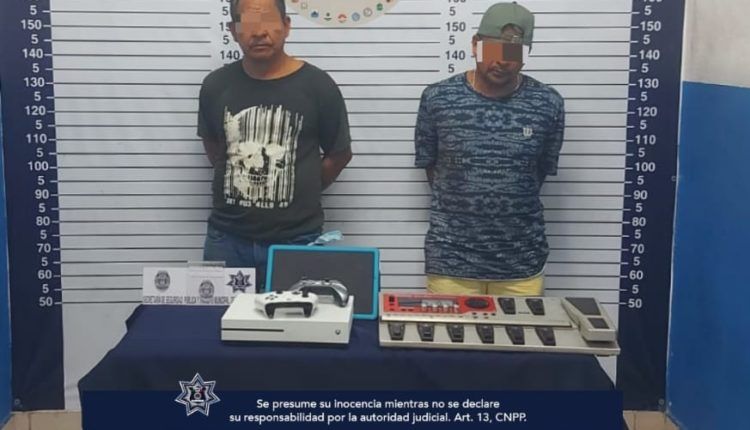 Playa del Carmen.- Policías de la Secretaría de Seguridad Pública y Tránsito Municipal de Solidaridad, aseguraron a dos sujetos luego de que presuntamente cometieran delito de robo a una casa habitación, en el fraccionamiento Cataluña Uno.