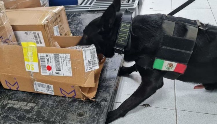 Playa del Carmen, Quintana Roo, 13 de agosto de 2021.- El binomio canino “Roca” de la Policía Municipal Preventiva, frustró él envió a través de una empresa de mensajería de tres paquetes de marihuana que ingeniosamente el remitente había ocultado dentro de un reproductor de DVD.