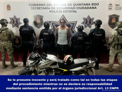 En otro hecho, en Benito Juárez, Gabriel Adolfo “N” fue detenido en el fraccionamiento Cielo Nuevo, supermanzana 249, luego de que presuntamente se atravesó de forma desafiante ante elementos del Grupo Centurión, en coordinación con la Marina, la Defensa Nacional y la Guardia Nacional. Según el informe, el hombre insultó a los oficiales, hizo señas obscenas y lanzó golpes, por lo que fue asegurado y presentado ante la Fiscalía.