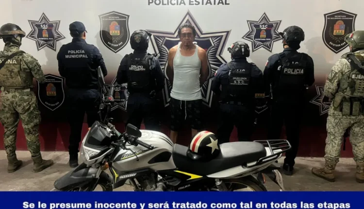 En Othón P. Blanco, elementos de los grupos Orión y Centurión de la Secretaría de Seguridad Ciudadana, en coordinación con la Marina, la Defensa Nacional y la Policía Municipal, detuvieron a Juan Francisco “N”, quien conducía una motocicleta Italika FT150, modelo 2025, color gris, presuntamente a exceso de velocidad y de manera imprudente.