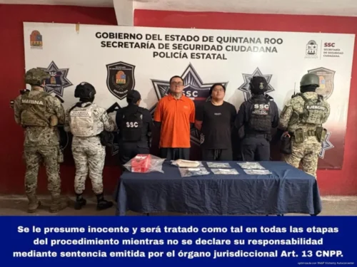 También en Benito Juárez, José Francisco “N” y Eduardo Daniel “N” fueron detenidos en el fraccionamiento Paseos Kusamil, supermanzana 110, luego de ser sorprendidos presuntamente intercambiando bolsitas con vegetal verde similar a la marihuana detrás de un mototaxi. En el sitio fueron aseguradas 47 bolsitas tipo ziploc con presunta marihuana, un mototaxi Piaggio color guinda sin placas, una sobaquera, una mariconera y una caja roja.