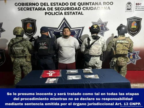 En otro operativo, Edwin Alejandro “N” fue detenido sobre la avenida Tulum, entre Xcaret y Cobá, en la supermanzana 52 de Benito Juárez. Las autoridades informaron que fue sorprendido manipulando bolsitas con presunta marihuana junto a un vehículo Mitsubishi Mirage azul. Tras la revisión, fueron aseguradas 30 bolsitas con vegetal verde similar a la marihuana, 23 bolsitas con fragmentos cristalinos similares al cristal, un celular, una mochila deportiva roja y 200 pesos en efectivo.