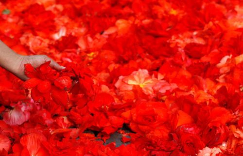 Las begonias, las dalias, la corteza y el pasto son los elementos fundamentales del tapiz floral que representan varios elementos de estas tres manifestaciones culturales, como las aves o el fuego.