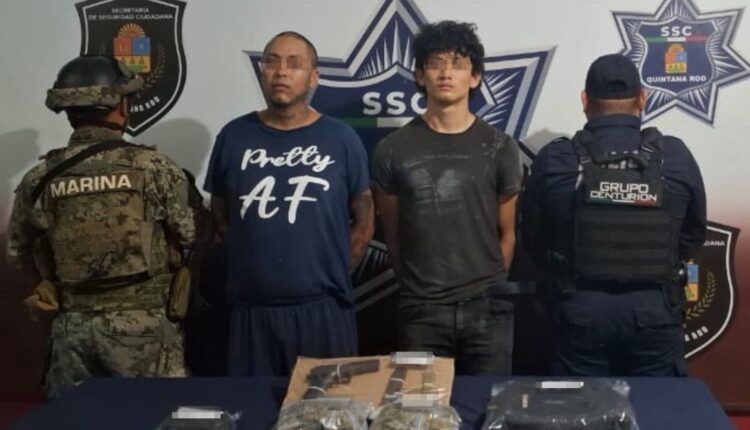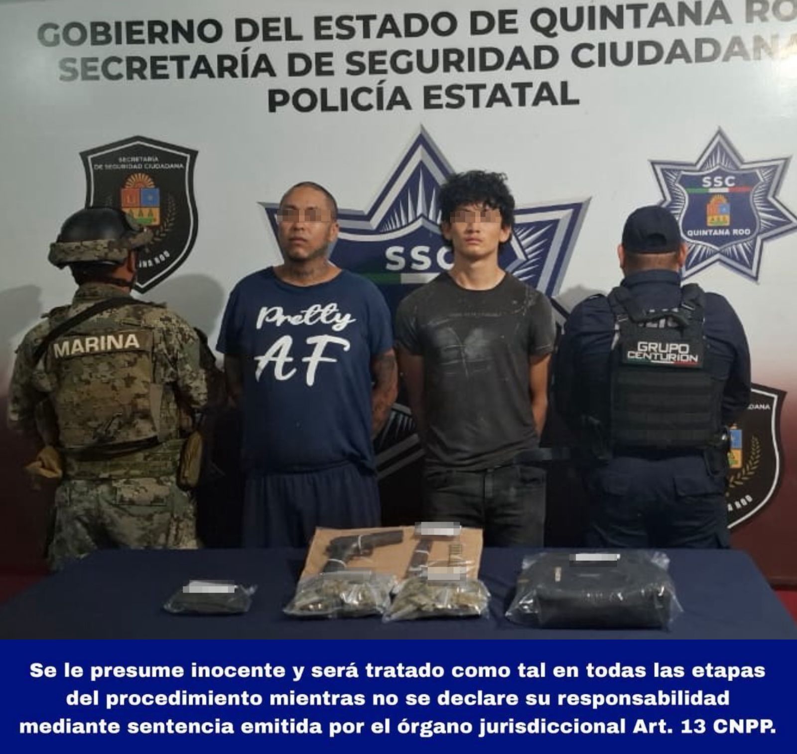 Cancún.– En una operación conjunta, elementos del Grupo Centurión de la Secretaría de Seguridad Ciudadana, con apoyo de la Secretaría de Marina, lograron la detención de dos sujetos identificados como Francisco Arturo “N” y Ulises Daniel “N”, señalados como presuntos responsables de delitos contra la salud y violación a la Ley Federal de Armas de Fuego y Explosivos.