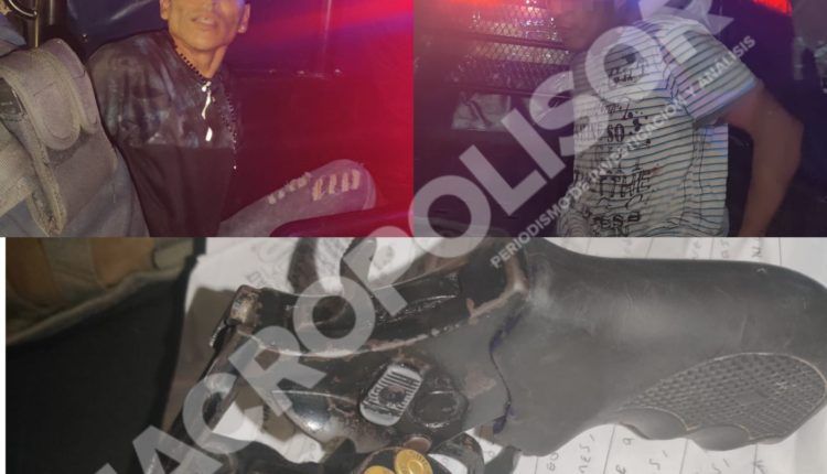Playas del Carmen, a 1 de octubre de 2021.- La policía municipal capturó a dos sujetos, Erick N y Eleazar N, por la portación de pistola tipo revolver abastecida con 6 cartuchos útiles.